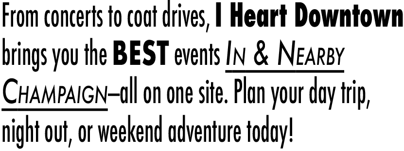 Events In & Nearby Champaign Explore a HUGE array of happenings from every corner of our community. Discover the best offers in town with featured discounts and promotions on food and drinks at local bars and restaurants! For all music-related events, from large concerts to local band performances. Includes food festivals, wine tastings, brewery tours, and dining events. For theater performances, art exhibitions, film screenings, and cultural festivals. Perfect for enthusiasts eager to learn, share, and connect. Escape to tranquility with events designed for unwinding and/or intimate experiences—perfect for spa days, weekend getaways, and memorable date nights. Covers sporting events, outdoor activities, fitness classes, and recreational gatherings. A hub for local vendors and shoppers seeking quality goods in a lively market atmosphere. Includes fairs, festivals, community gatherings, and local markets. For lectures, workshops, seminars, and other educational events. Discover joyful events for everyone where family fun and furry friends create lasting memories. Aimed at events happening in the evening like standup, club nights, live DJ sets, and themed parties. Focuses on business expos, networking events, and industry-specific conferences. For fundraisers, charity galas, and events aimed at supporting causes.
